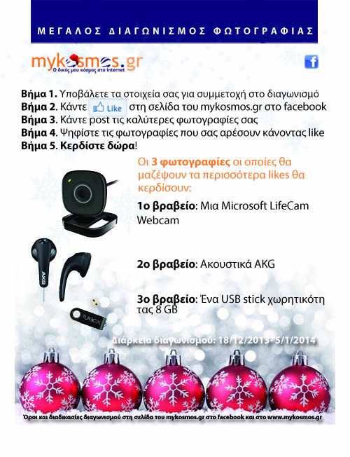 7. Στις 6/1/2014 θα γίνει η καταμέτρηση των likes για κάθε φωτογραφία που έχει γίνει post στη σελίδα του mykosmos.gr κατά την περίοδο 18/12/2013 - 5/1/2014